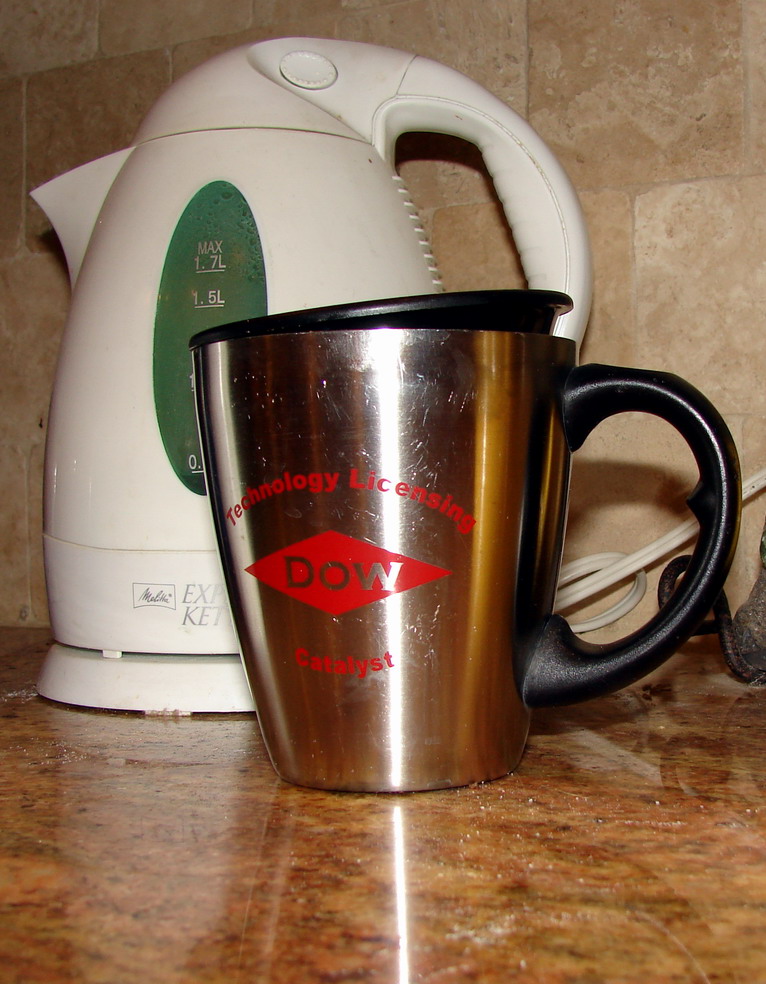 There is rummaging in the kitchen. The sound of water hums through the pipe and gushes out the faucet; an electric tea kettle is being filled for my husband’s morning tea. Cabinet doors open and out comes a thermal mug with the red Dow Chemical diamond logo on it.
