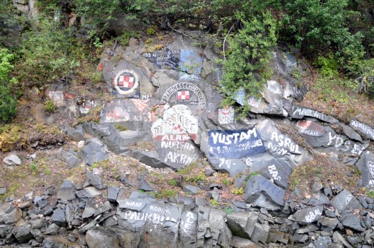 Not all rocks require excavation. I found a good many turned into billboards, like these that line Skagway’s port and harbor. But nowhere did I find evidence of new buildings beside old ones within historic districts. Rather than tearing down and building new, like the good folks of West “U” – that posh neighborhood inside Houston’s Loop, where many three story mini-mansions keep company with cottage bungalows — the people of Juneau and Skagway tend to recycle, to just make do with their land. Between mountains and sea, there’s no other choice but to make do.