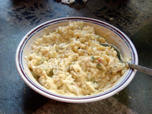 Five hundred miles away and who knows how many years, egg salad has found a permanent  spot on my rotating lunch menu —  though no longer  limited to Wednesdays.  And while there are many recipes for egg salad — I believe my father favored one including chopped olives — I like this one the best.  Appropriately, it hails from a recipe I found in the pages of Southern Living, which I’ve adapted to my own taste.