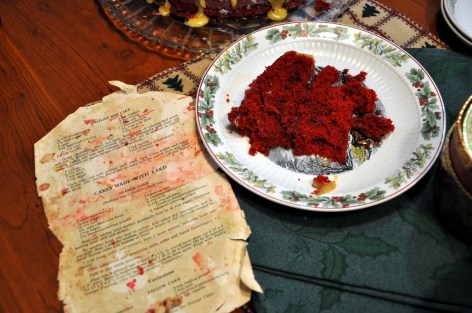 But keeping a memory alive is a tricky business. It doesn’t just happen — nor does it happen, I think, by keeping up certain traditions or by following a recipe to the letter. At least, this is what I woke up to this morning. Because yesterday, though our red cake was a little crusty around the edges, and therefore, less than perfect — though we fell short in recreating Mom’s legend of a red cake — we walked away with something better; we walked away with not just a piece of dry cake, but a piece of Mom’s reality — something a little crusty around the edges — something a little like Mom would have baked herself — something even close to the person Mom was in real life.